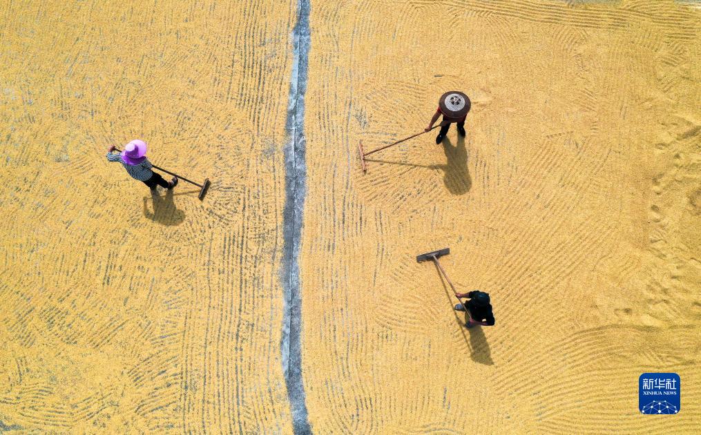 金秋時節,各地農民抓住晴好天氣晾曬收獲的高粱、水稻、玉米等糧食作物,呈現多彩的豐收圖景。