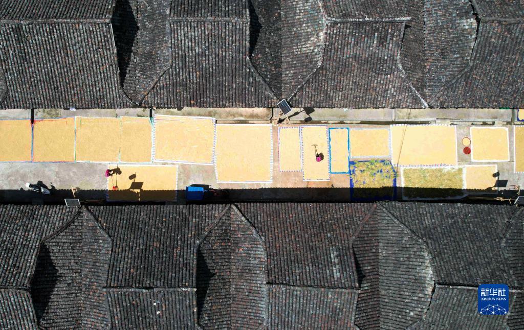 9月16日,在貴州省黔東南苗族侗族自治州從江縣加勉鄉(xiāng)污扣村,村民在晾曬稻谷(無人機(jī)照片)。