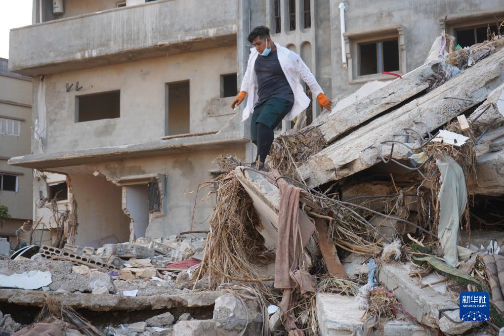 9月16日,救援人員在利比亞德爾納的建筑廢墟上工作。