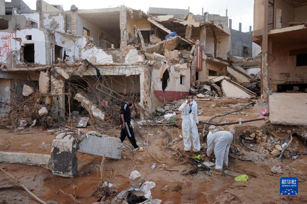 9月16日,救援人員在利比亞德爾納的建筑廢墟旁工作。
