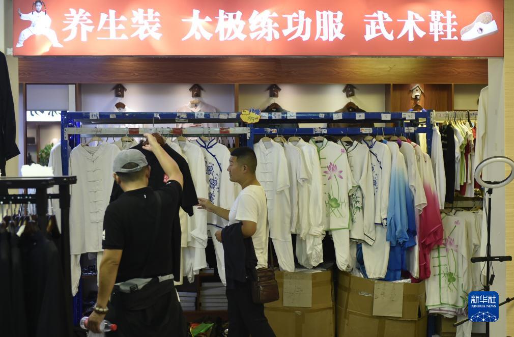 9月15日,游人在河南溫縣陳家溝的一家店鋪內(nèi)挑選太極練功服。
