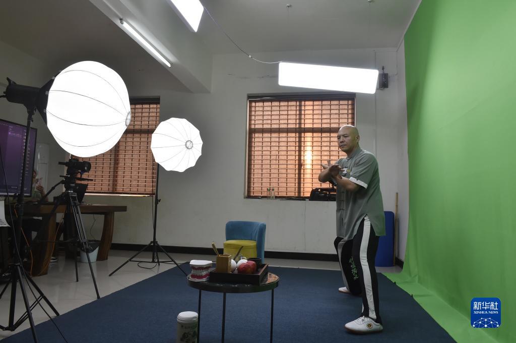 9月15日,太極拳傳人王戰(zhàn)軍在河南溫縣陳家溝自己的武校直播間內,通過網(wǎng)絡直播推廣太極拳。