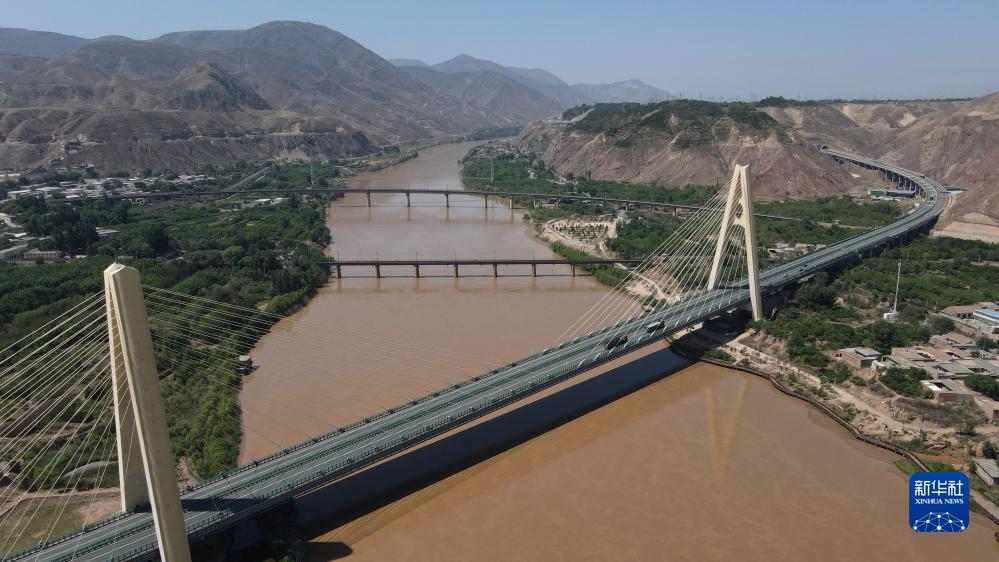 緊鄰甘肅省蘭州市西固區河口古鎮的高速公路大橋橫跨黃河(7月9日攝,無人機照片)。