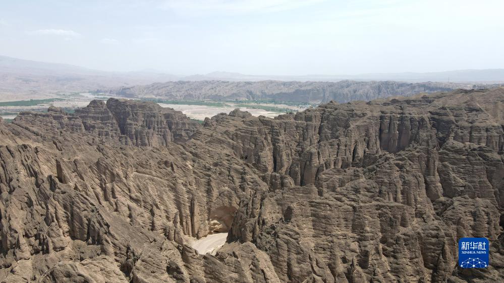 這是位于甘肅省白銀市景泰縣中泉鎮龍灣村的黃河石林景觀。黃河石林千峰競奇、峽谷蜿蜒,與黃河遙相呼應,形成山環水轉、動靜結合的自然奇觀(7月11日攝,無人機照片)。