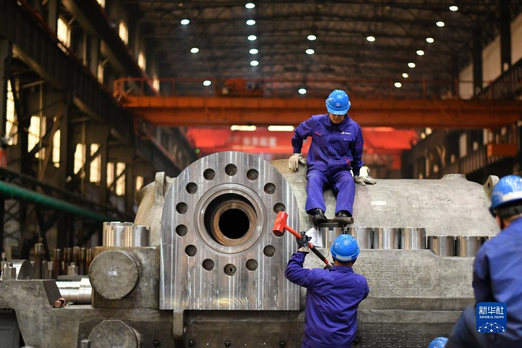 在哈電集團哈爾濱汽輪機廠有限責任公司車間,工人在生產作業(2023年4月11日攝)。