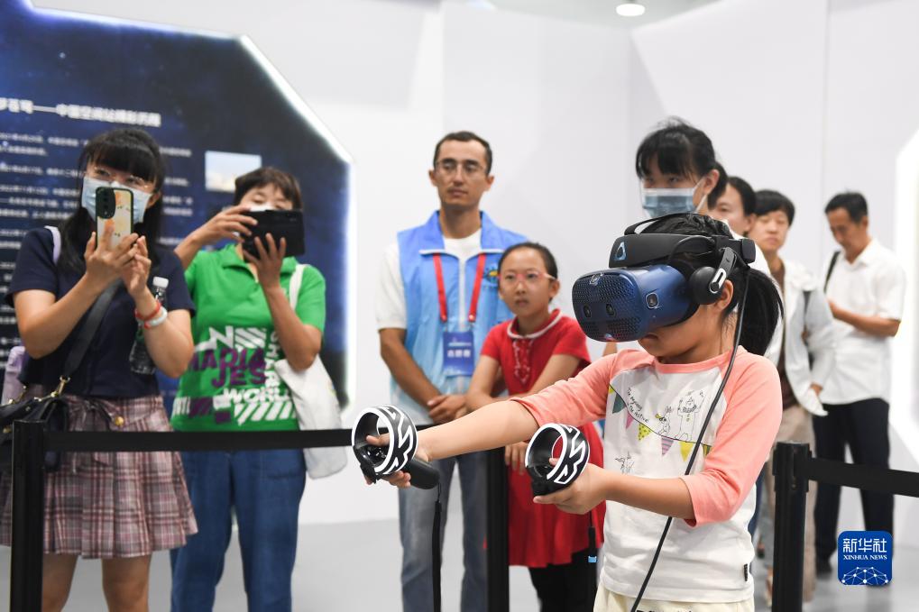 9月17日,在全國科普日北京主場活動展區(qū),小朋友使用虛擬現(xiàn)實設(shè)備感受天和核心艙內(nèi)的生活。