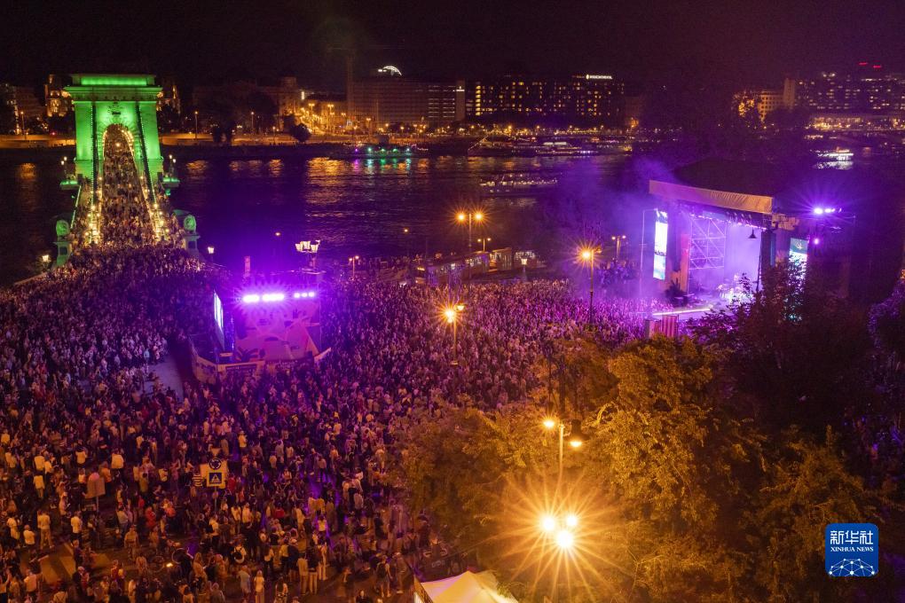 9月16日,人們在匈牙利首都布達佩斯著名地標鏈子橋畔欣賞音樂會。
