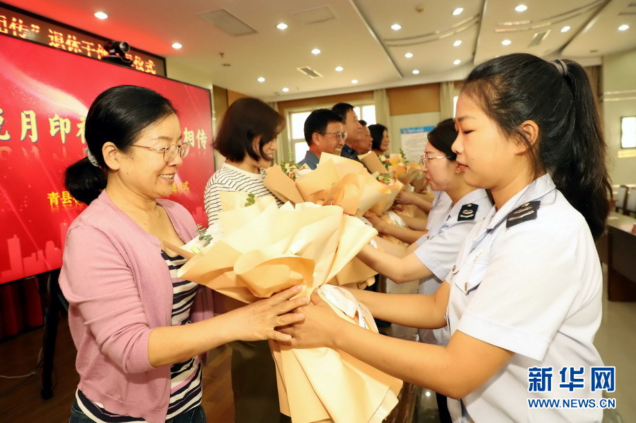 9月15日,國家稅務總局青縣稅務局的年輕稅務干部為退休的老稅官們獻花。新華網發(巴芳 攝)