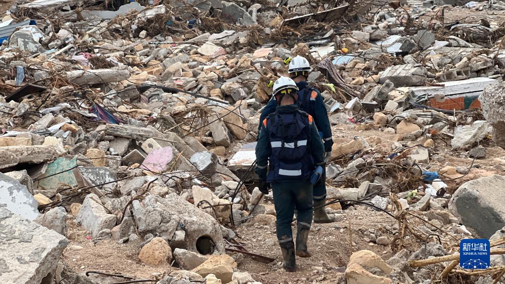 9月17日,國際救援人員在利比亞德爾納的建筑廢墟上工作。