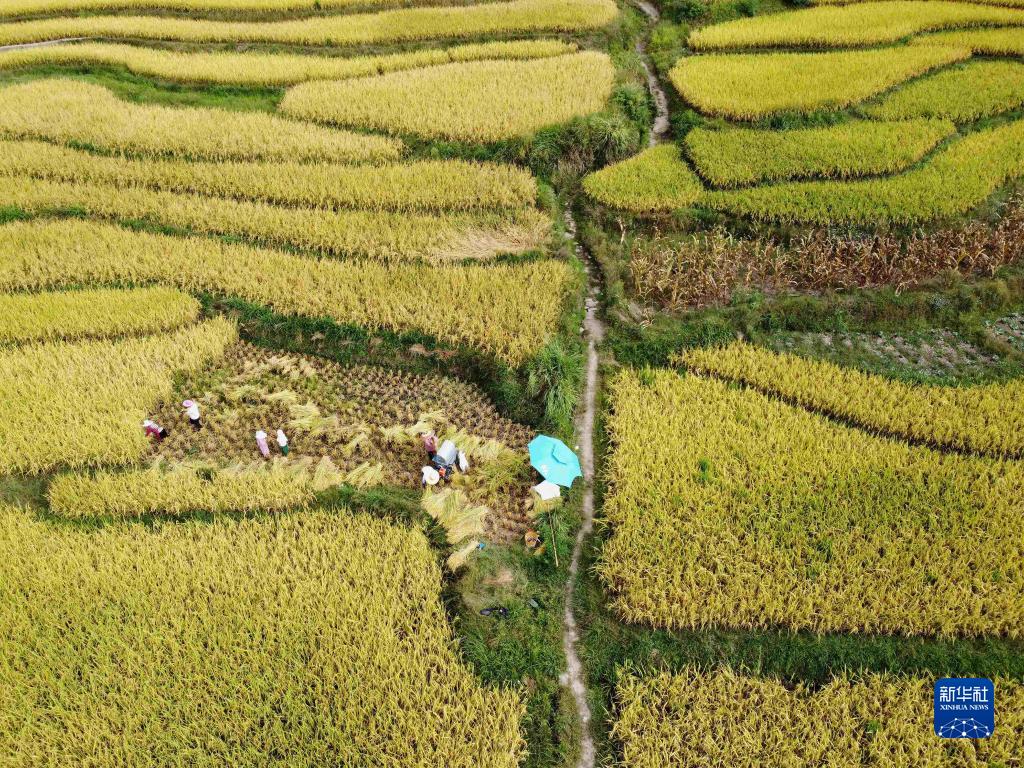 9月17日,在貴州省黔東南苗族侗族自治州施秉縣城關(guān)鎮(zhèn)下翁哨村,村民在收割水稻(無(wú)人機(jī)照片)。