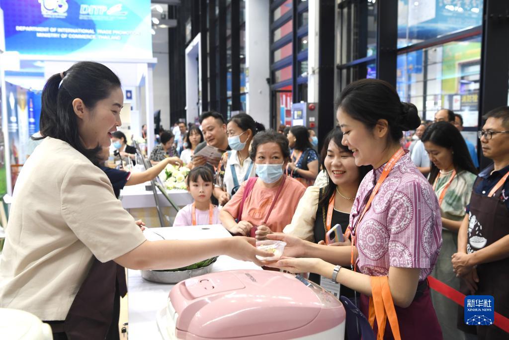 9月18日,在南寧國際會展中心,觀眾在泰國商品館排隊品嘗泰國香米。