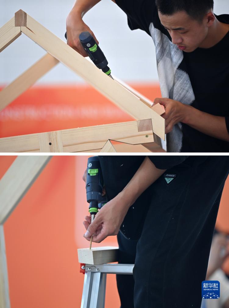 9月18日,選手在國家會展中心(天津)參加木工項目的比賽(拼版照片)。