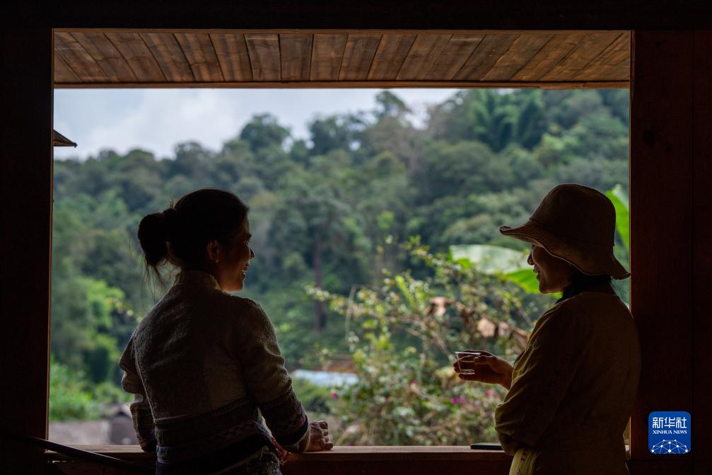 來自廣東的游客(右)在景邁山糯崗古寨傣族茶農(nóng)家品嘗普洱茶(9月14日攝)。