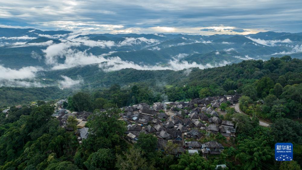 被山林與茶園環繞的景邁山翁基古寨一景(無人機照片,9月17日攝)。