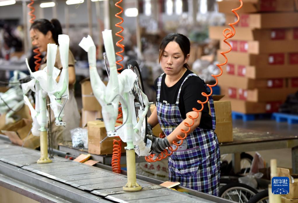 9月18日,河北省威縣一家童車生產(chǎn)企業(yè)工人在生產(chǎn)車間組裝童車。