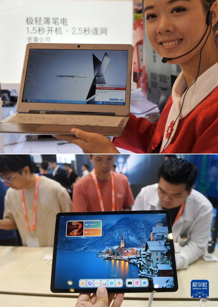 拼版照片:上圖為2011年10月25日,在第8屆中國—東盟博覽會上,參展商在展示一款筆記本電腦(新華社記者周華攝);下圖為2023年9月18日,在第20屆中國—東盟博覽會上,人們在了解平板電腦(新華社記者陸波岸攝)。