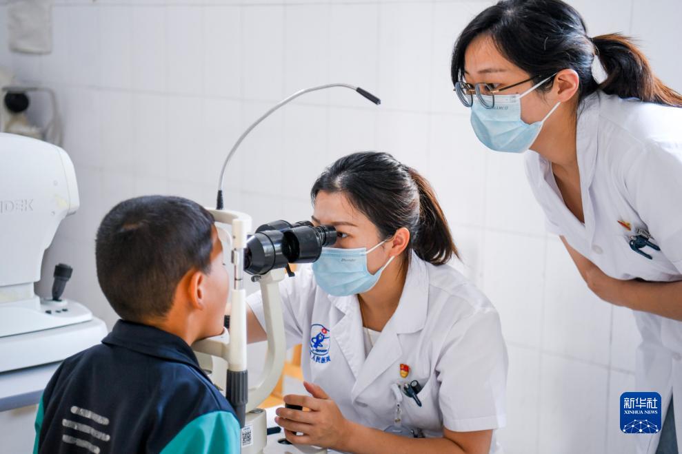 在新疆喀什地區(qū)英吉沙縣人民醫(yī)院眼科檢查室內(nèi),眼科主任劉媛媛(中)和來(lái)自山東省濟(jì)寧市第三人民醫(yī)院的援疆醫(yī)生石文芳(右)為小患者進(jìn)行檢查(9月15日攝)。