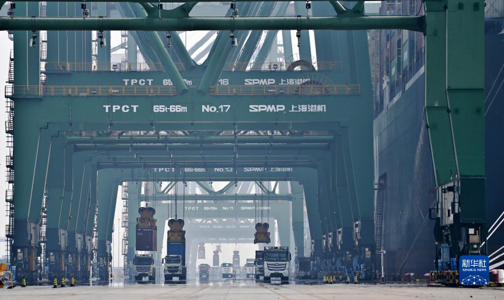9月18日,卡車在天津港太平洋國際集裝箱碼頭運輸集裝箱。