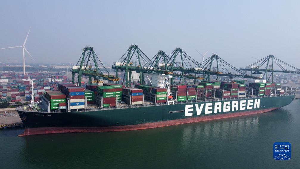 9月18日,一艘貨輪在天津港太平洋國際集裝箱碼頭進行裝卸作業(無人機照片)。