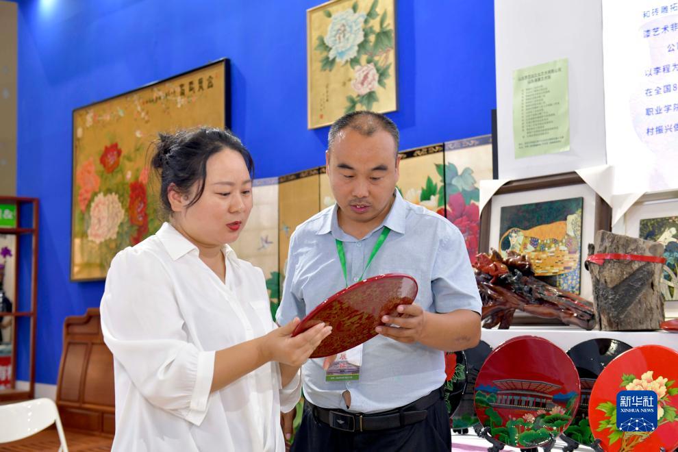 9月19日,在菏澤國際會展中心,觀眾在了解漆器產品。