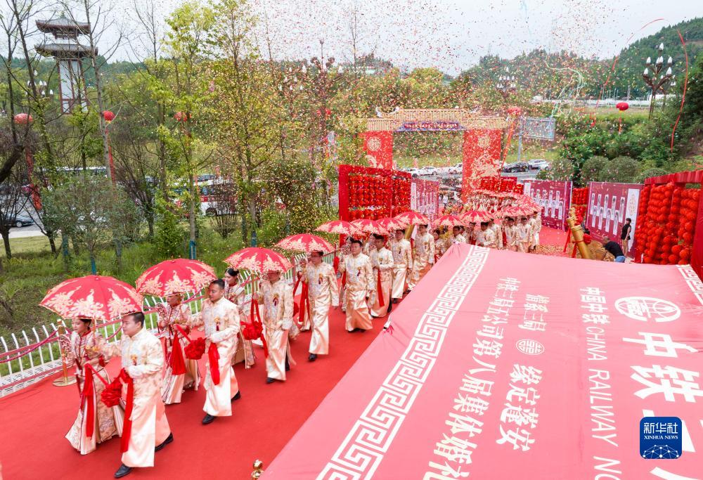 當日,在成達萬(成都經達州至萬州)高速鐵路四川省蓬安縣燕山寨隧道口的施工工地,來自中鐵三局五公司各建設工地的38對新人,身著中國傳統婚禮服飾參加集體婚禮。
