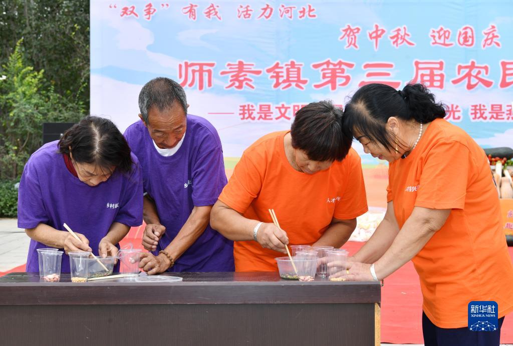 當(dāng)日,河北省滄州市肅寧縣師素鎮(zhèn)舉辦農(nóng)民趣味運(yùn)動會,人們通過參與運(yùn)花生、貼辣椒、豆類分揀等趣味運(yùn)動項目,慶祝豐收。