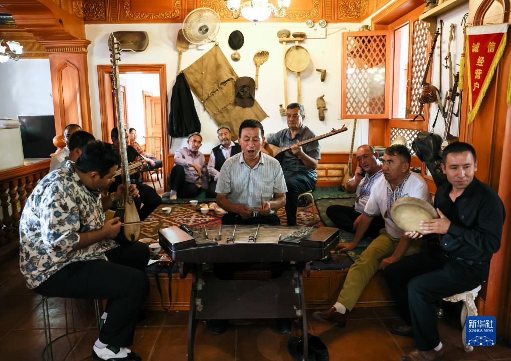 樂手在新疆喀什古城百年老茶館內彈唱(9月7日攝)。
