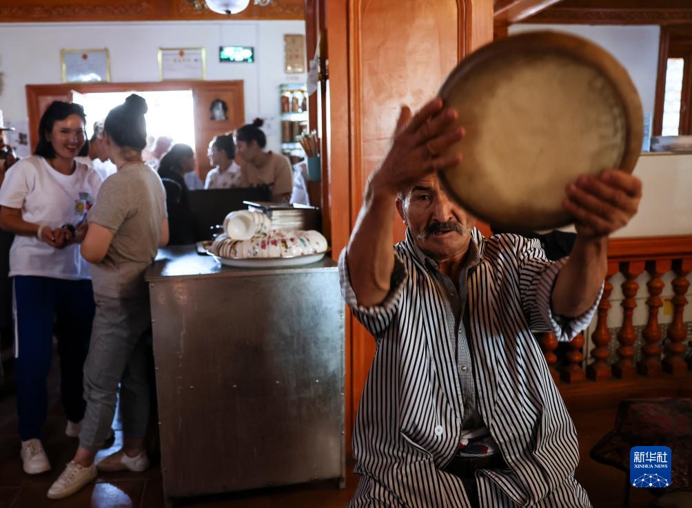樂手在新疆喀什古城百年老茶館內擊鼓唱歌(9月7日攝)。