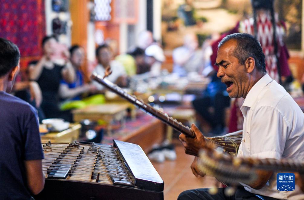 樂手在新疆喀什古城百年老茶館內彈唱(9月15日攝)。