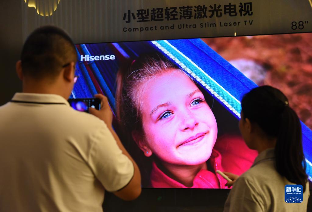 9月19日,參會(huì)者在激光顯示技術(shù)成果展示區(qū)觀看一款超輕薄激光電視。