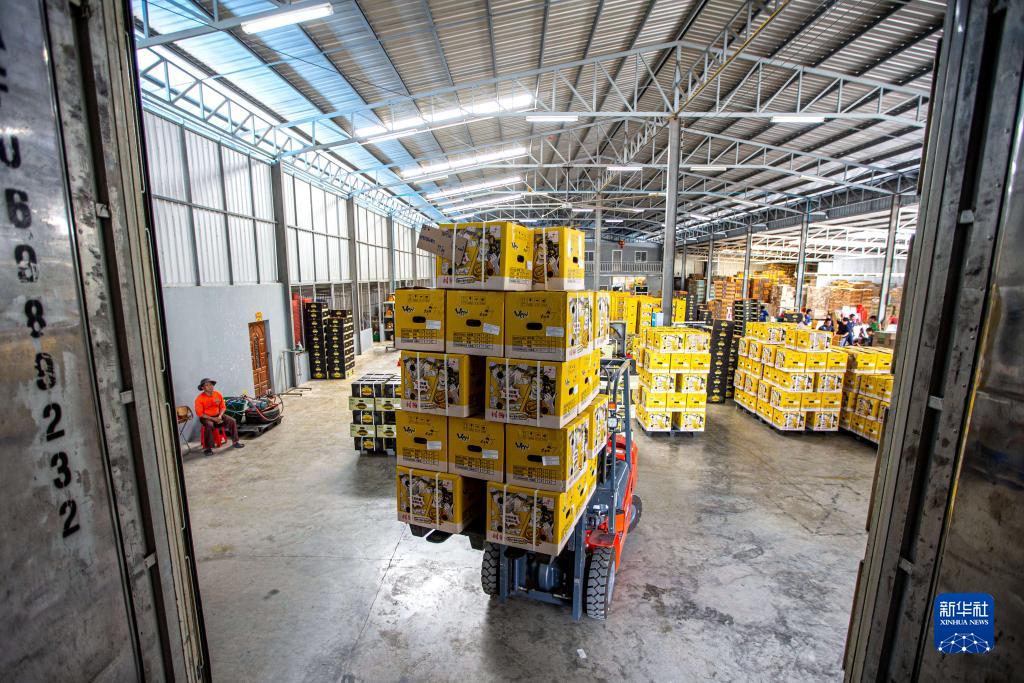9月19日,在泰國春蓬府一家榴蓮工廠內,工作人員將包裝好的榴蓮裝車。