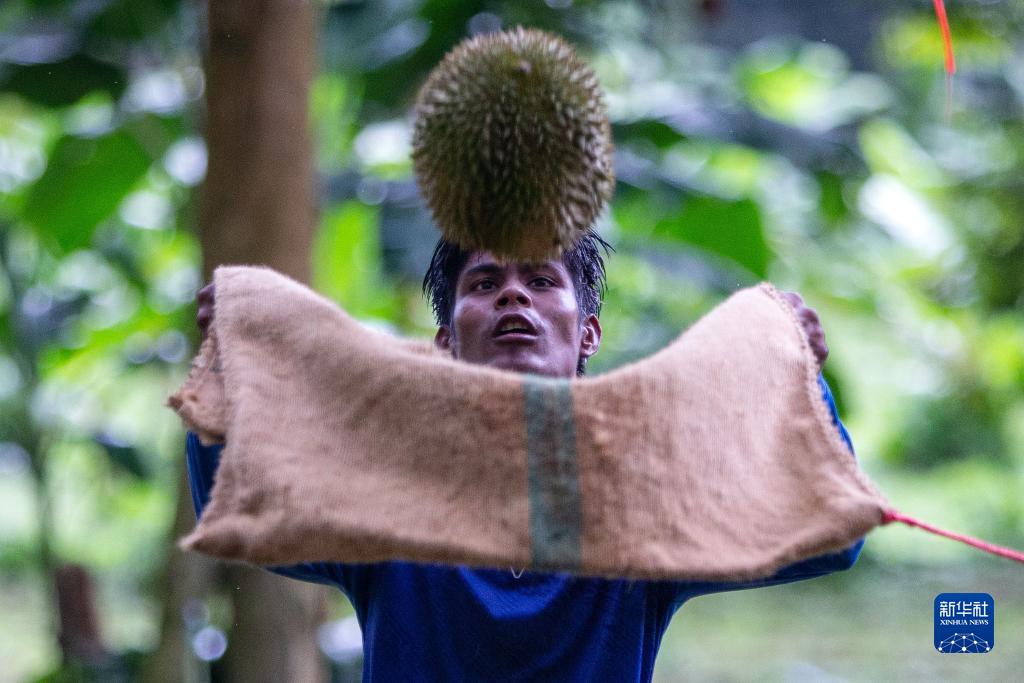 9月18日,在泰國春蓬府一處果園內(nèi),工人在樹下接榴蓮。