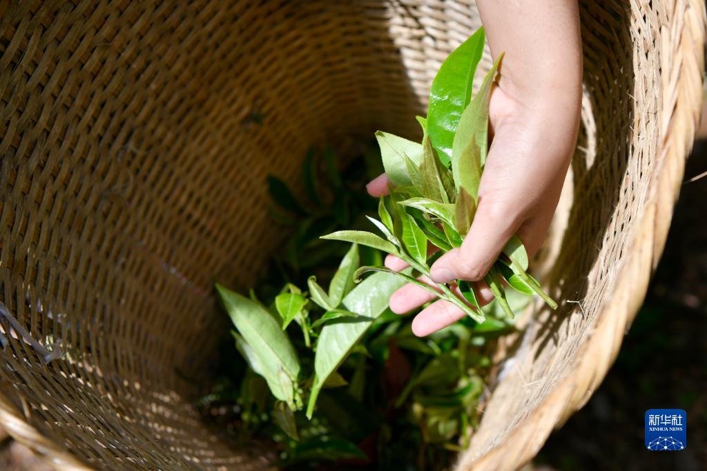 9月19日,景邁山翁基古寨的布朗族茶農(nóng)玉炳把采摘的秋茶放入竹簍。