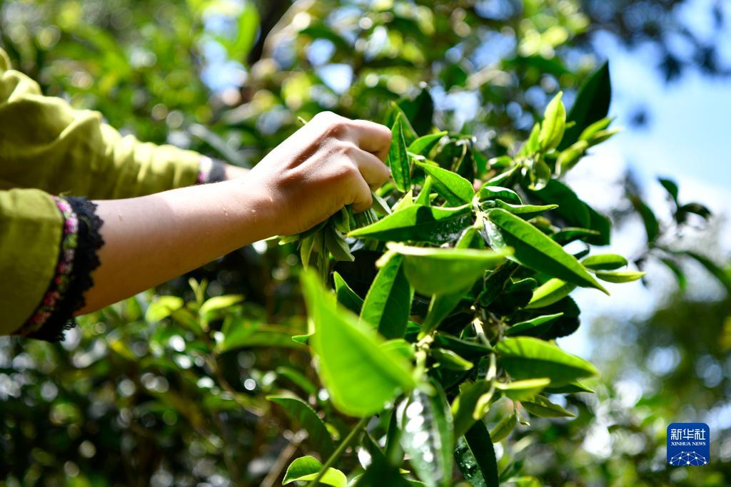 9月19日,景邁山翁基古寨的布朗族茶農(nóng)玉勐在古茶林里采摘秋茶。