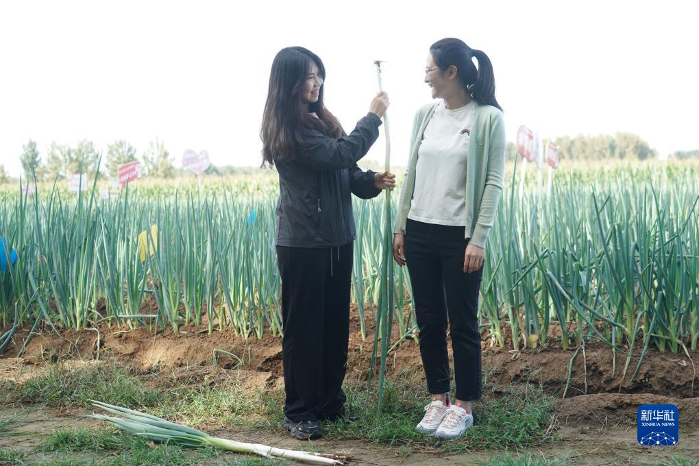9月20日,在北京市平谷區(qū)東高村鎮(zhèn)趙家務(wù)村大蔥種植基地,市民與大蔥比高度。