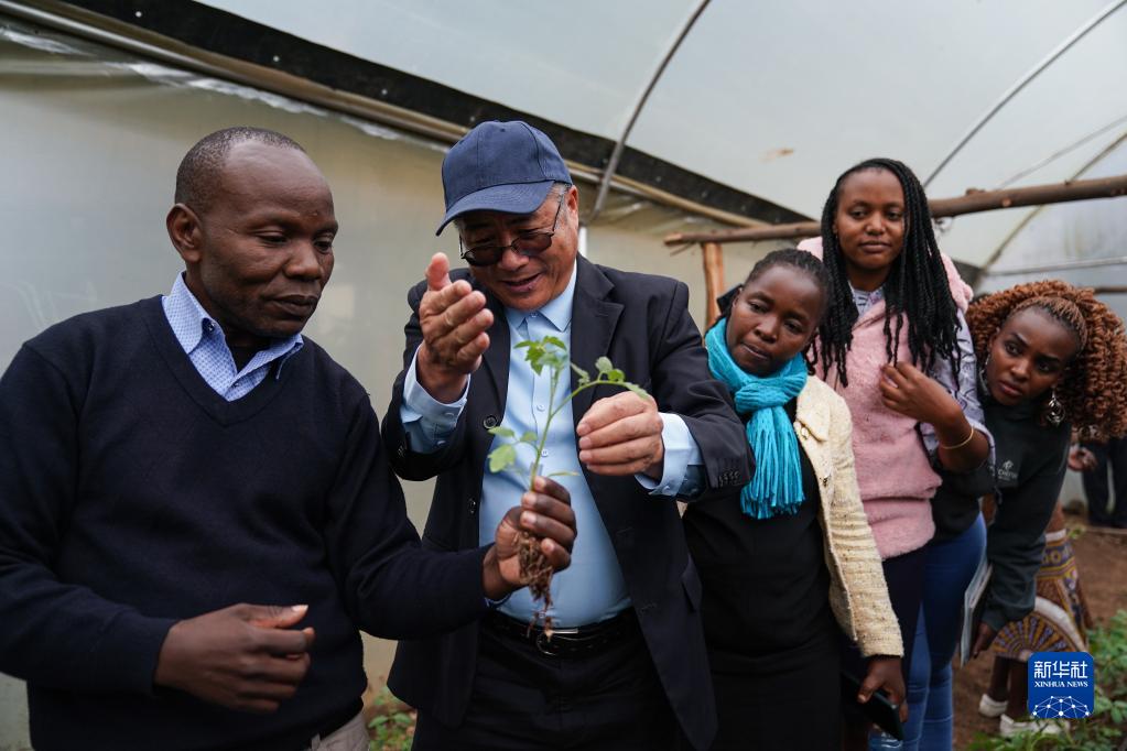 9月18日,在肯尼亞納庫魯郡馬坦吉提薩村,來自中國的農學教授劉高瓊(左二)為肯方學員指導農業技術。