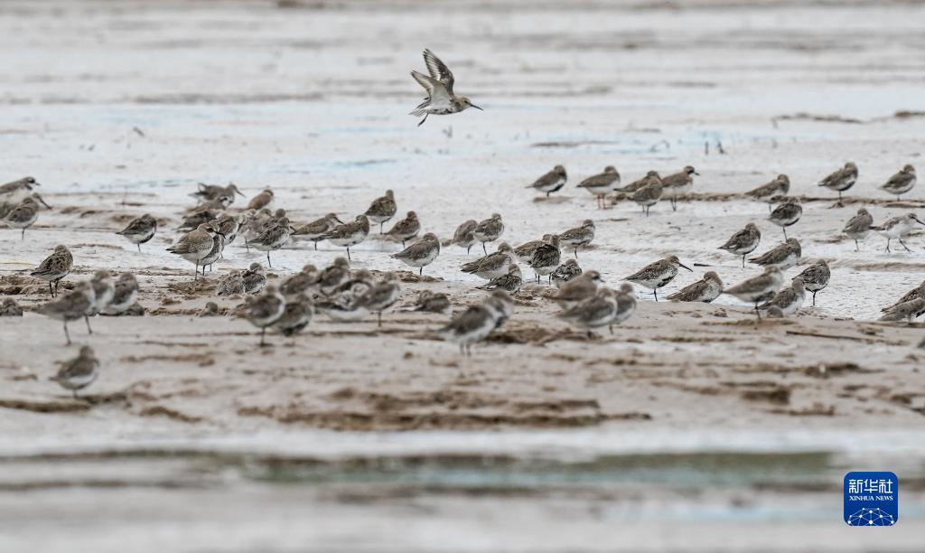 一群鳥棲息在東臺(tái)條子泥濕地的灘涂上(8月31日攝)。