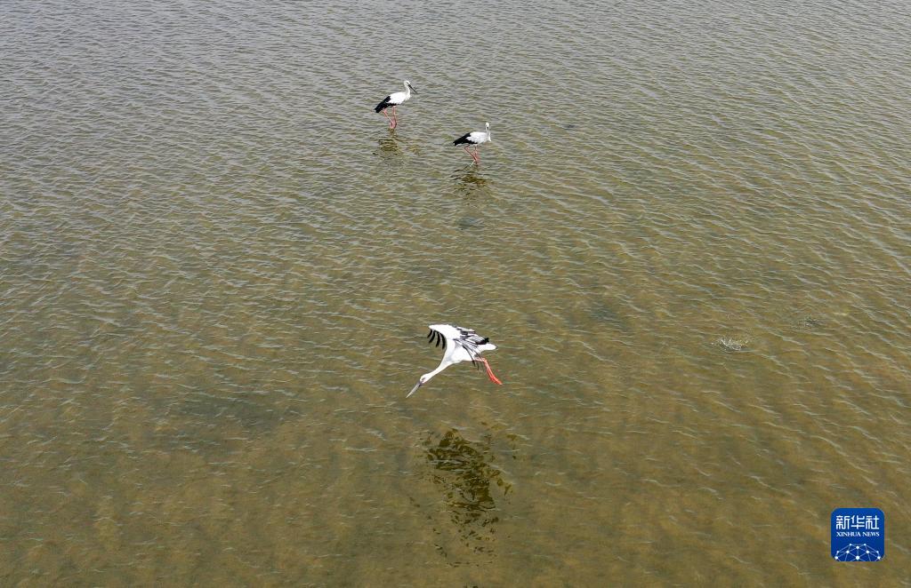 東方白鸛在東臺條子泥濕地覓食(8月31日攝)。