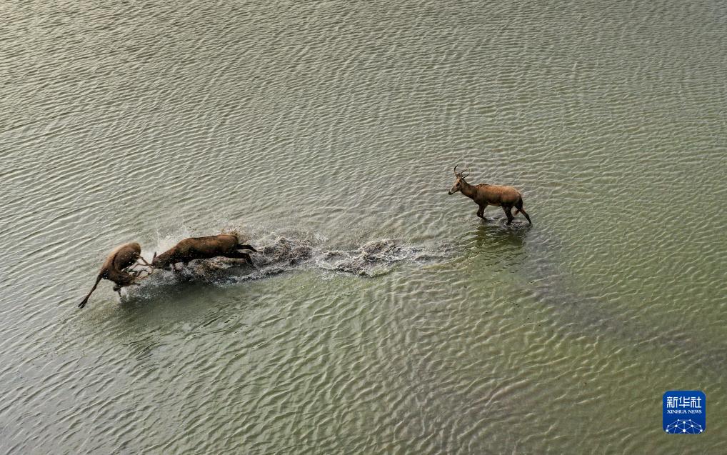 麋鹿在大豐麋鹿國家級自然保護區野鹿蕩的水塘里爭斗(8月20日攝,無人機照片)。