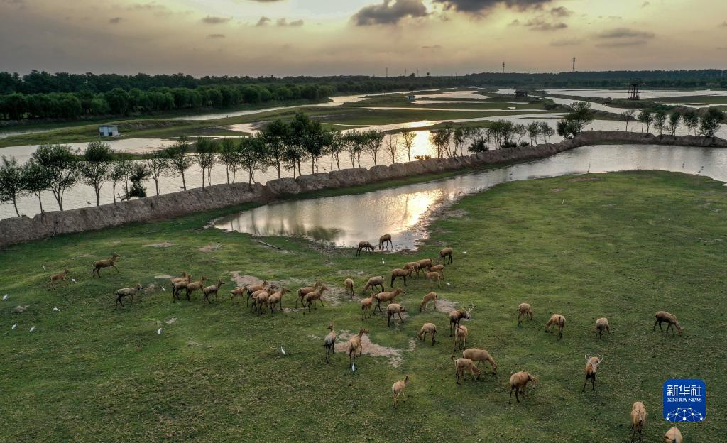 一群麋鹿在大豐麋鹿國家級自然保護區(qū)野鹿蕩憩息(8月20日攝,無人機照片)。