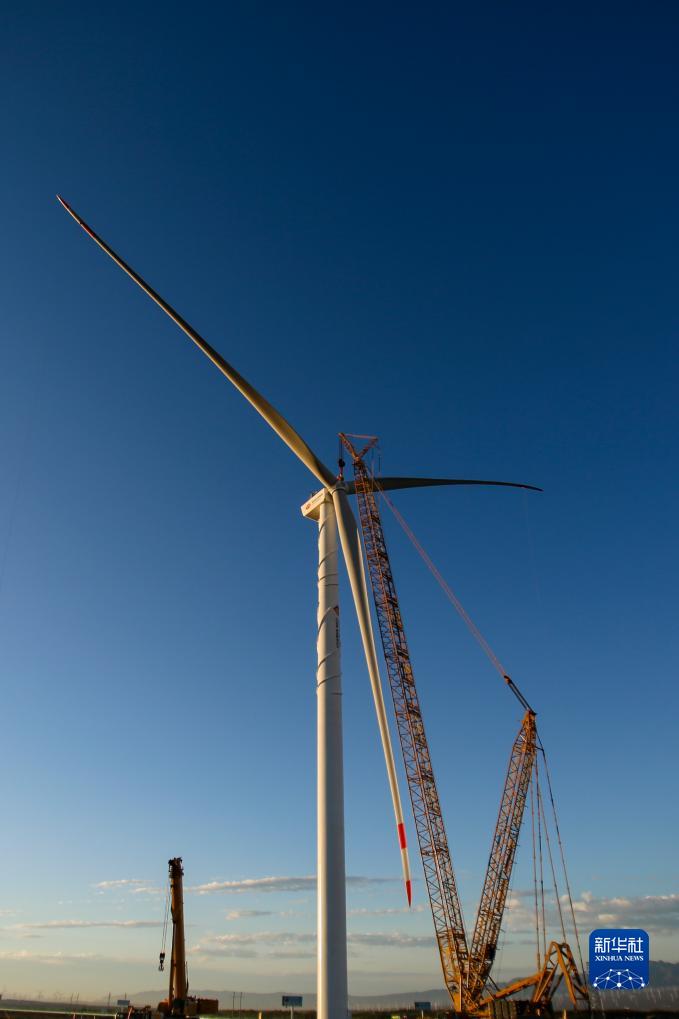 在新疆達坂城風電場拍攝的一臺風力發電機組吊裝作業現場(8月4日攝)。