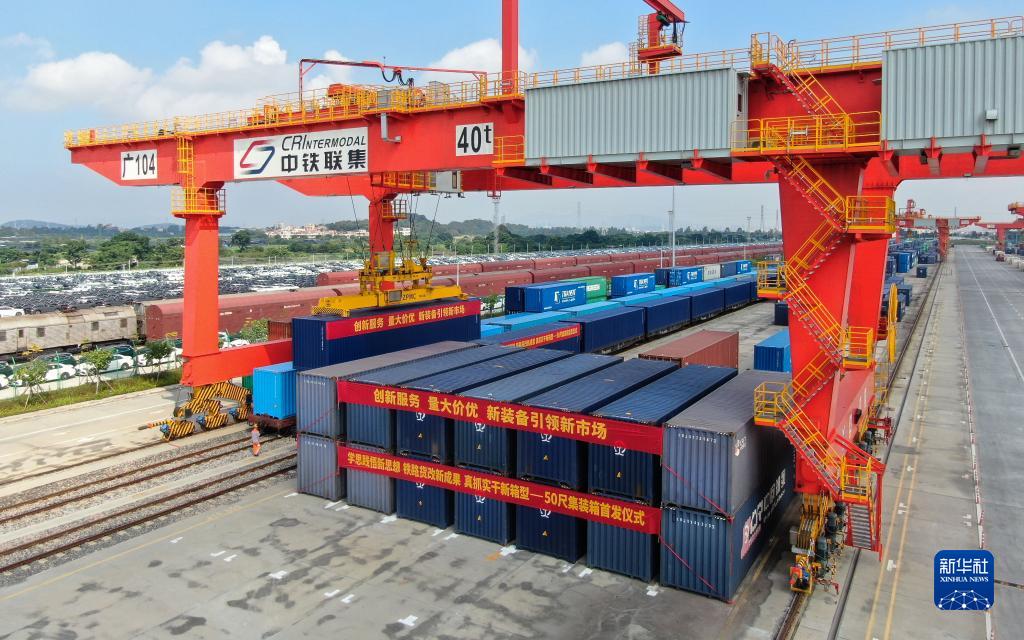 9月20日,在廣州國際港,起重機(jī)將50英尺集裝箱吊運(yùn)到貨運(yùn)列車上(無人機(jī)照片)。
