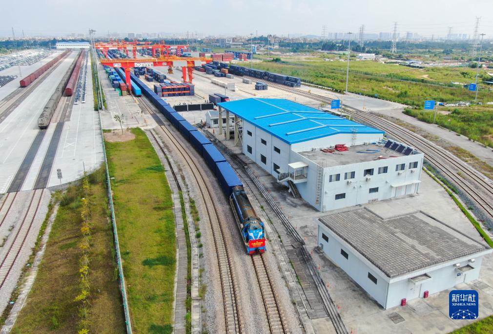 9月20日,50英尺集裝箱多聯快車X802次貨運列車從廣州國際港駛出,一路北上向著長沙而行(無人機照片)。