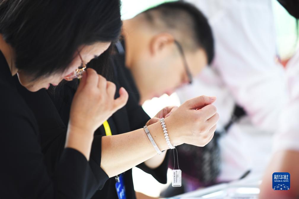 9月20日,觀眾在鄭州國際會展中心試戴鉆石首飾。
