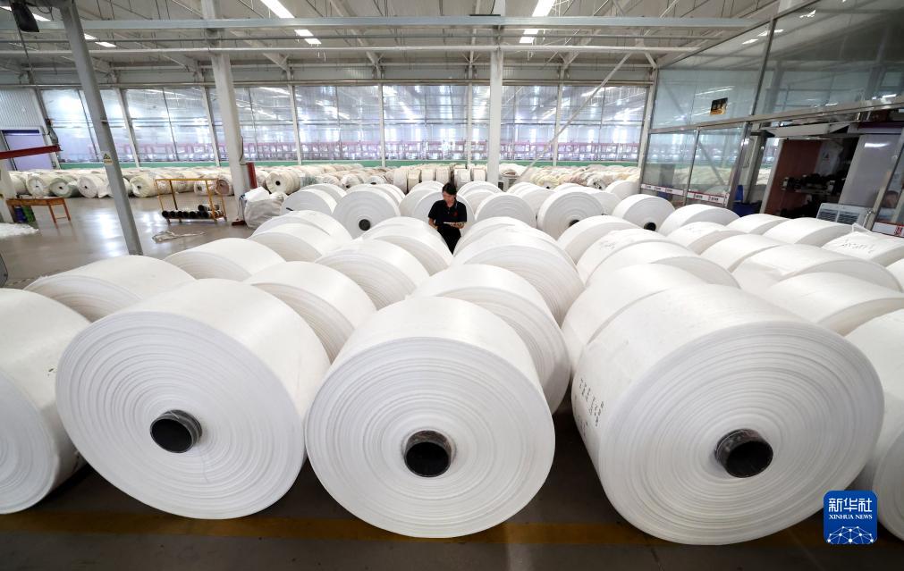 9月20日,行唐縣一家包裝生產企業的工人在檢查包裝成品膜。