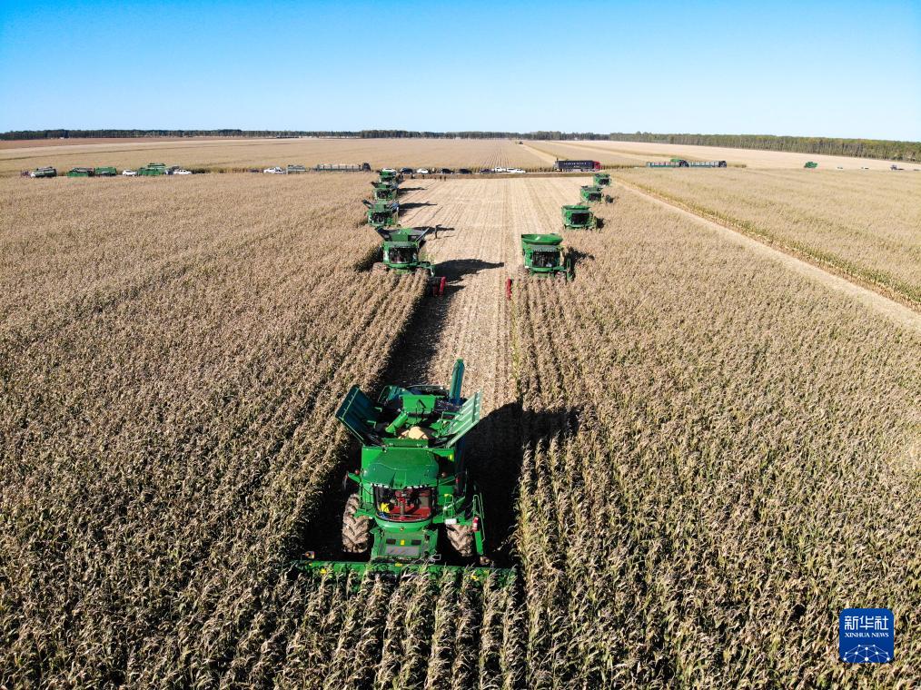 這是9月20日在北大荒農(nóng)業(yè)股份有限公司友誼分公司一玉米種植地塊拍攝的秋收現(xiàn)場(chǎng)(無人機(jī)照片)。