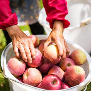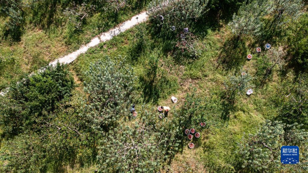 威寧彝族回族苗族自治縣雪山鎮謝家村村民在采收蘋果(9月20日攝,無人機照片)。