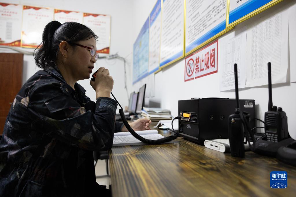 在長白山國家級自然保護區管理局頭西保護管理站,電臺員魏長娟正在與巡護員聯系,了解野外巡護情況(9月17日攝)。