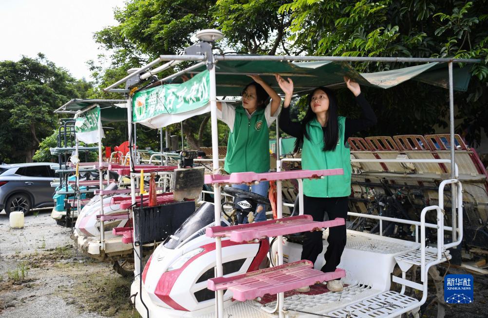 9月18日,在廣州市增城區(qū)石灘鎮(zhèn)石湖村的石鄉(xiāng)農(nóng)機專業(yè)合作社,連日大雨后,沈燕芬(左)和沈笑芬清理農(nóng)機遮陽棚。