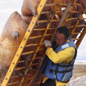 羊皮筏子承擔著黃河兩岸一代代人的勞動、生活、交通運輸的使命,見證了黃河歷史文化。作為筏子客,牛強認為他們僅僅是傳承了老祖先留下來的手工藝。然而,制作保養羊皮筏子的高成本和繁瑣流程讓這門技藝越來越“孤獨”。牛強介紹,從挑選五至六歲的公山羊開始,羊皮筏子的制作周期至少需要三個月。制作完成后,還要定期進行灌水灌油灌鹽和吹氣保養。這項被甘肅省列為非物質文化遺產的傳承人已寥寥可數,43歲的牛強是最年輕的一位,年紀最大的已經90多歲。